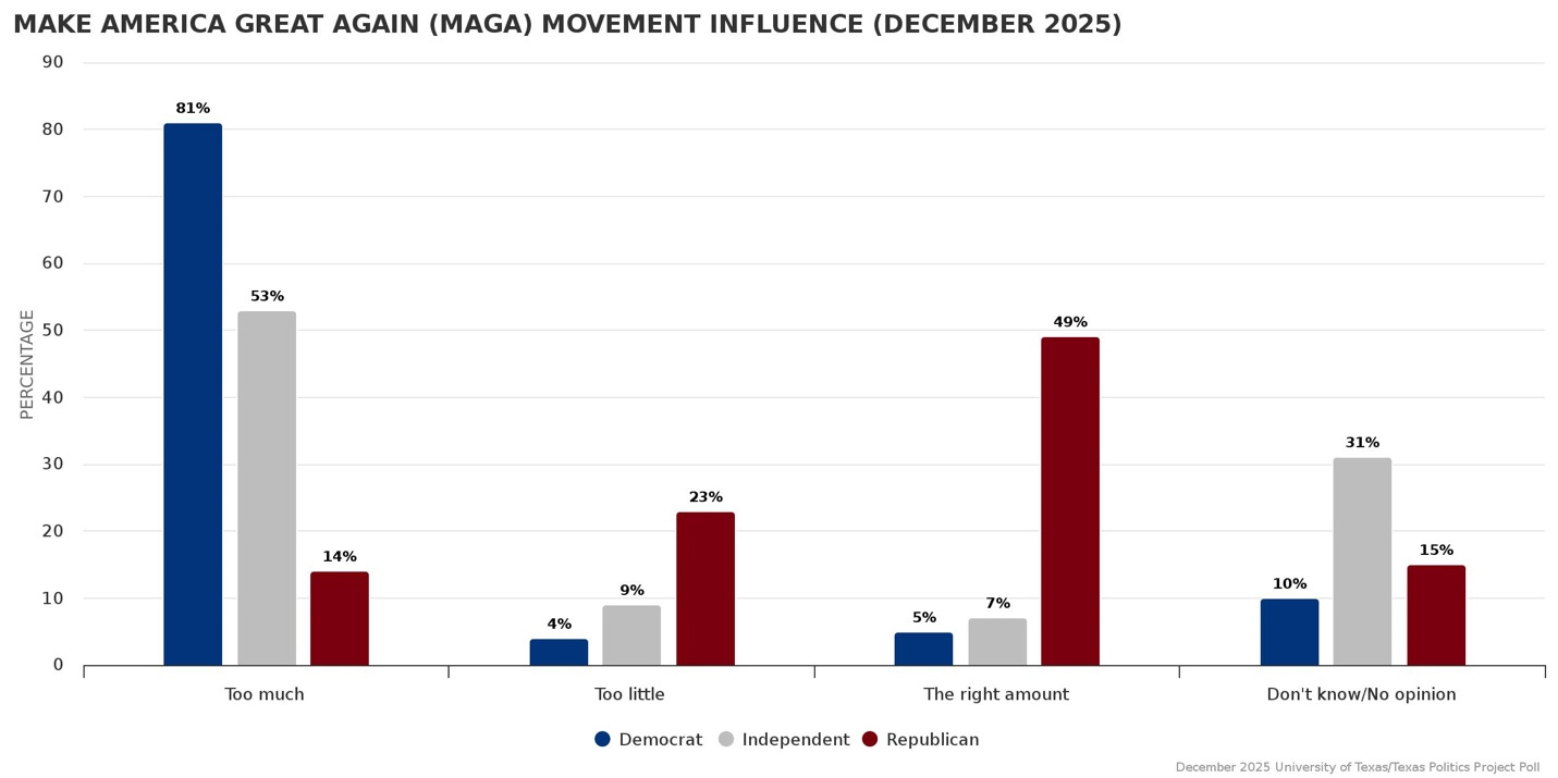 But there doesn’t seem to be any groundswell for deposing the Trump crime empire, at least in Texas. Texas is basically a 55% Republican state, and at least half of those people would vote for the bubonic plague if Trump endorsed it. (See the chart below, courtesy of our friends at the Texas Politics Project: half of Texas Republicans think MAGA has just the right amount of influence on the GOP; that’s the MAGA Koolaid drinkers.)